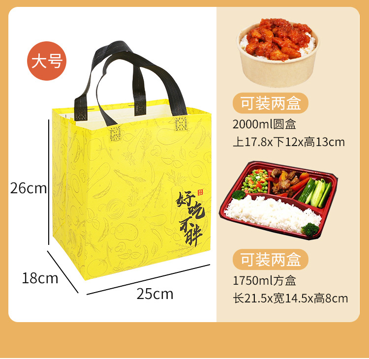 • 环保性:无纺布覆膜外卖袋是一种环保产品,客户在选择材质和设计时,应考虑到环保因素,尽可能选择可回收、可降解的材料。